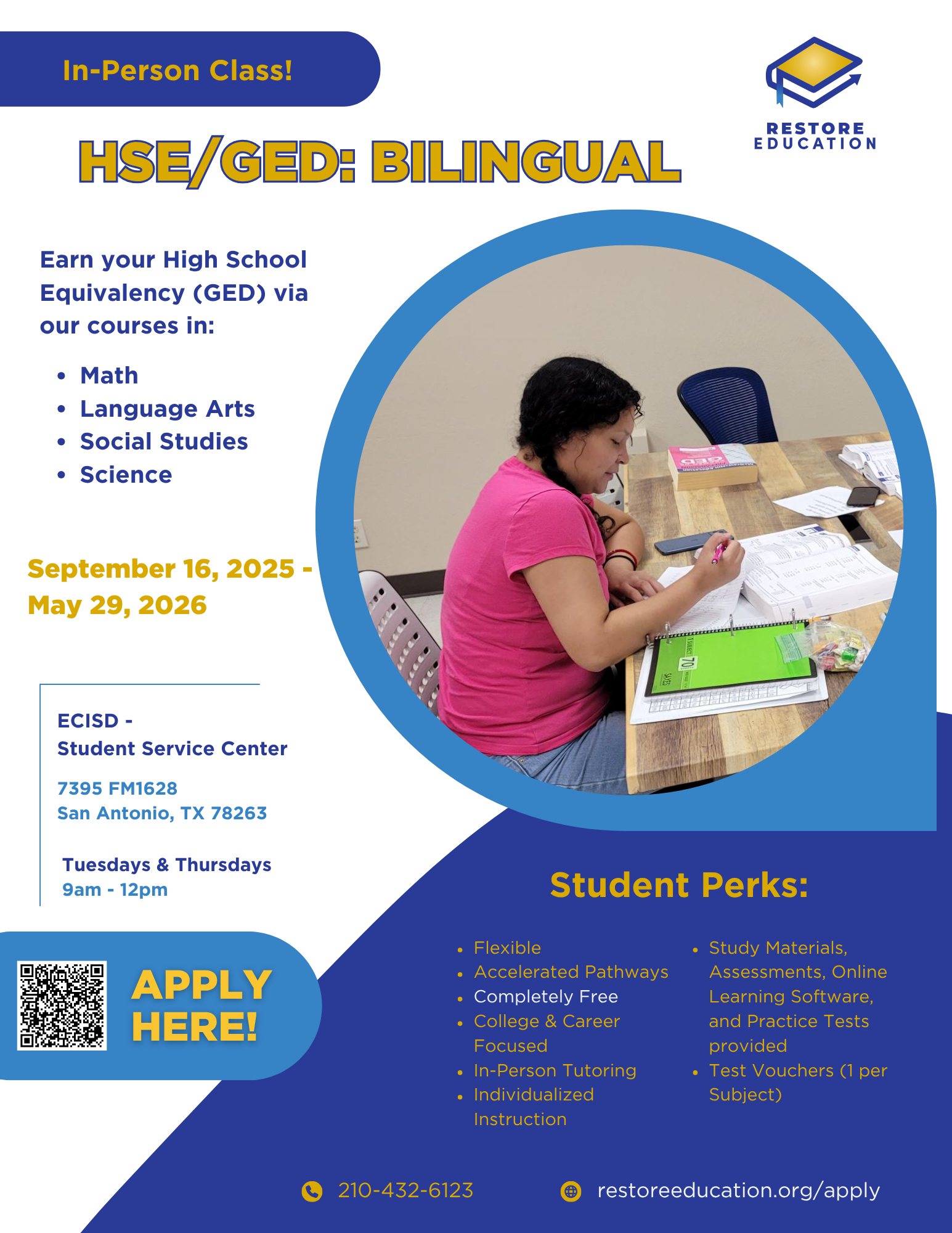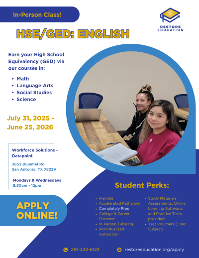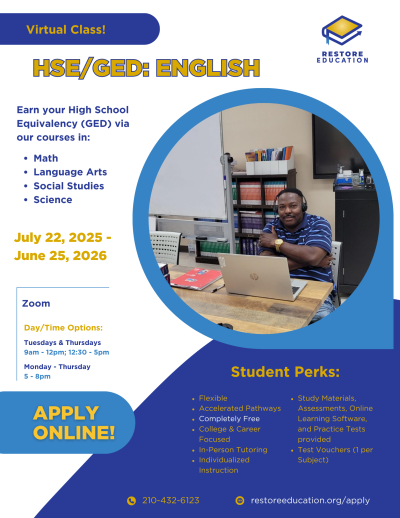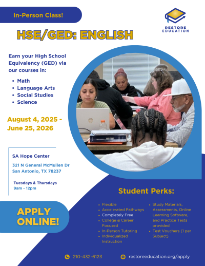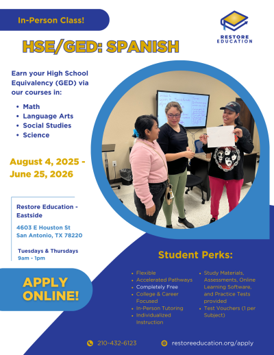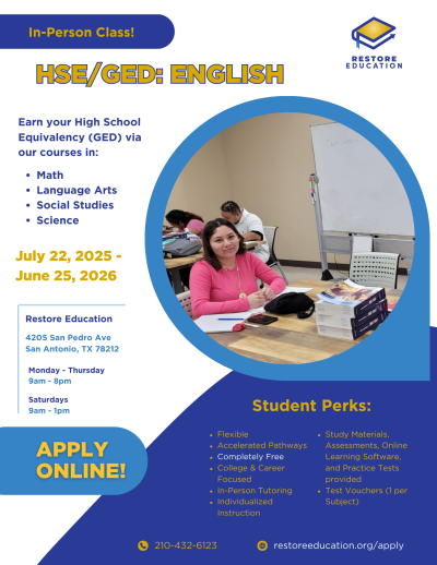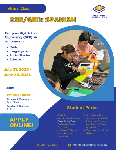 We offer High School Equivalency (GED) test preparation in both English and Spanish. Our proven individualized curriculum produces the highest completion rates in Bexar county. The average student completes our program in 6-12 months. 80% of our graduates go on to career training, college, or employment within a year of graduation.